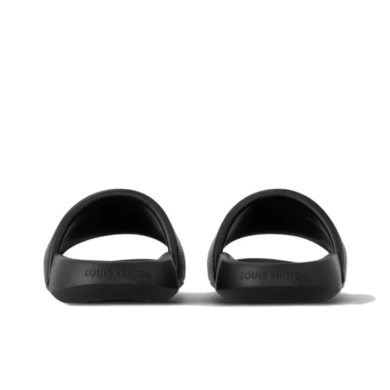 Minimalist and stylish, this slide features a matte black strap with an embossed monogram design. Elegant and versatile, perfect for both indoor lounging and outdoor wear.