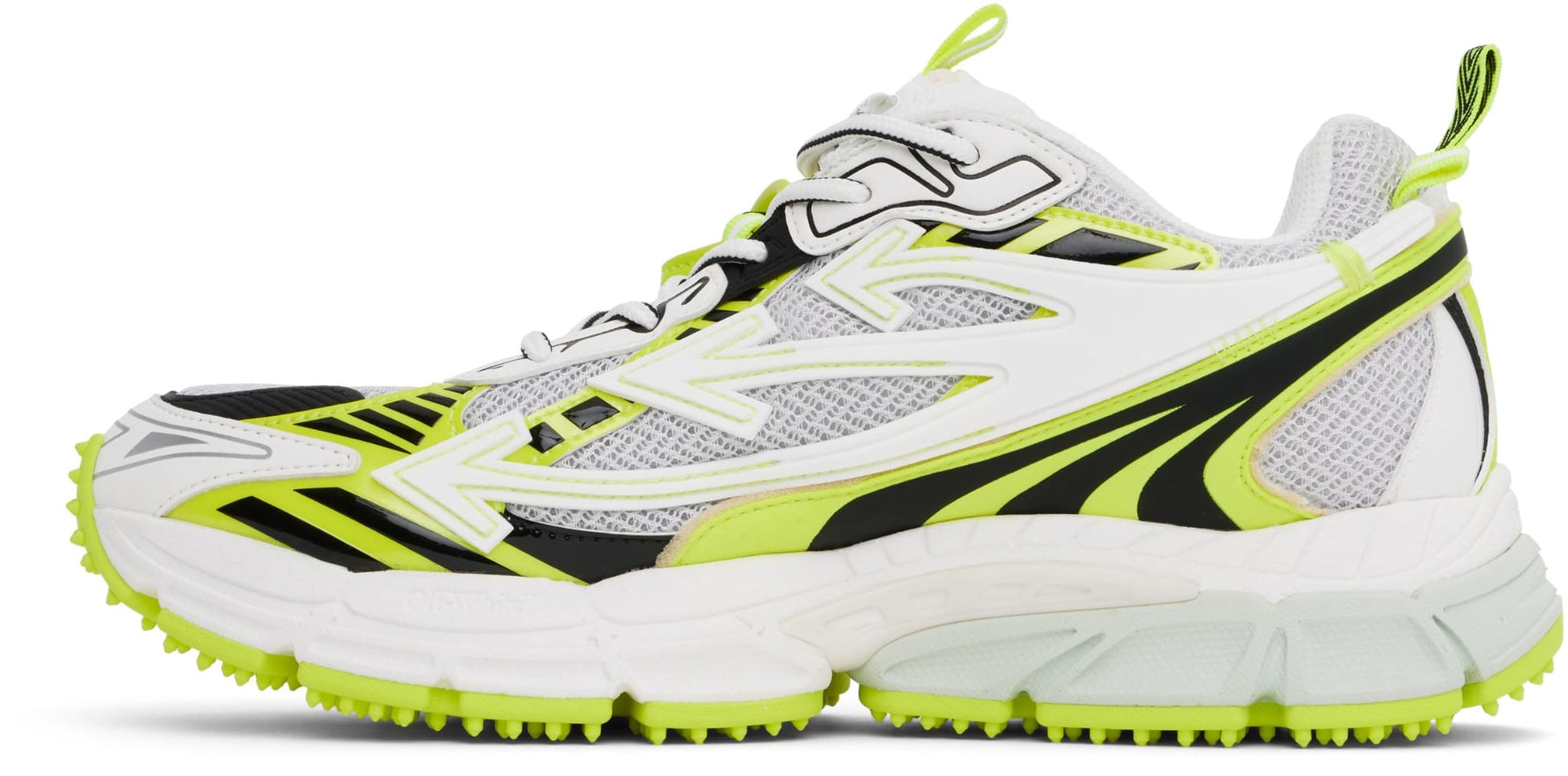 This high-tech sneaker blends a rugged trail-ready sole with sleek Off-White design cues. Featuring a breathable mesh upper, neon green and black accents, and signature arrow branding – it’s built for streetwear lovers and style trailblazers.